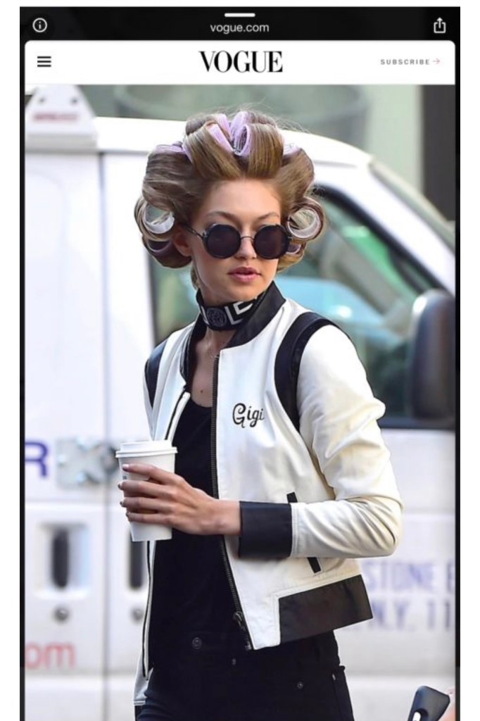 Whether wearing curlers publicly is just a practical means to get a wavy hair style, a symbol of protest, or a mark of a busy modern woman, it is a lovable trend. Of course, pink curlers are very I love-Lucy. A woman wearing them warrants a laugh/side-eye. In the U.S., we sometimes spot celebrities prancing around town in a crown of rollers (e.g. model Gigi Hadid and actor Bradley Cooper below)– a choice that reads “I am so untouchable, I can do anything and look good.” An online search reveals that actor/rapper Ice T wore rollers in high school as a sign of toughness. “See, there’s a level of gangster where you can do things that you’re really saying: ‘Don’t say nothin’ about it,’” he says. “It’s like the biker who might put a ribbon in his hair, like: ‘What? I’m waiting on you.’ So you have to have a certain level of credibility, but a lot of the cats were wearing perms and had rollers in their hair and we would get away with it.”