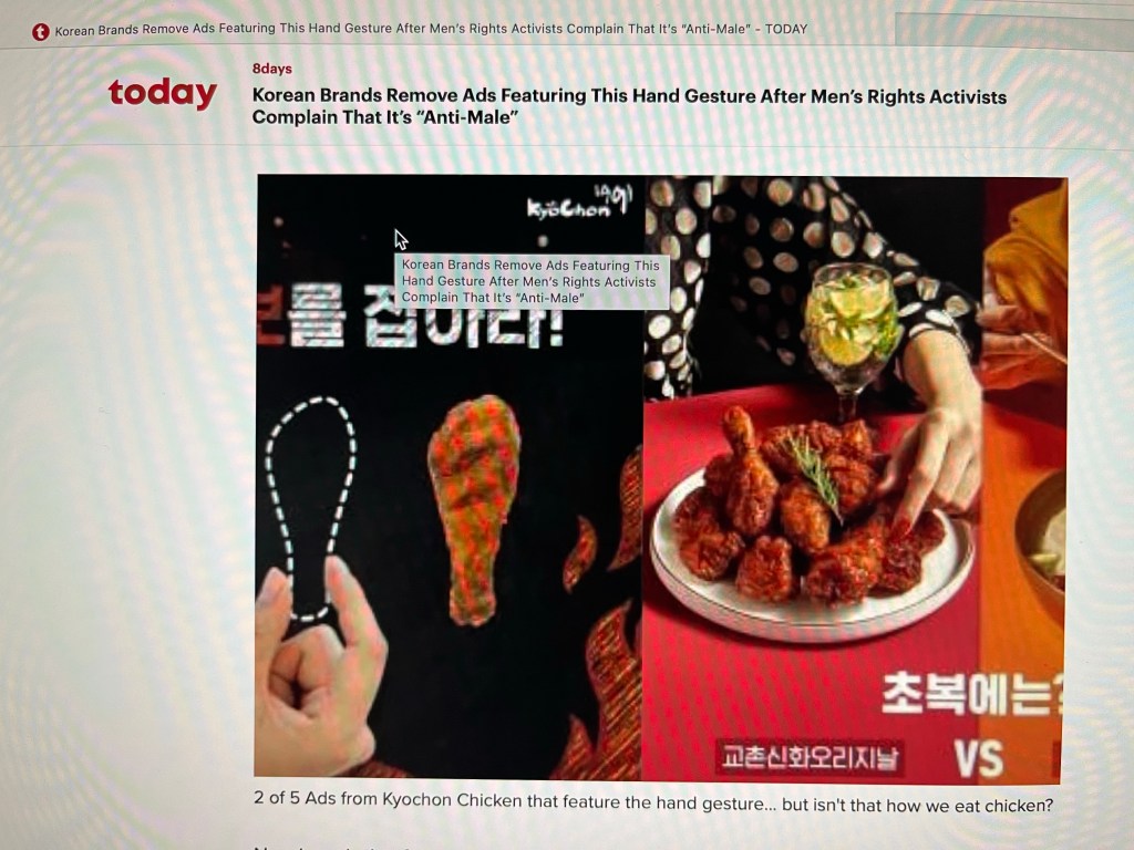 When the above ad for Korea’s largest convenience store ran in early 2021, men’s groups protested it arguing it demeaned men. Although the company denied this, the ad was pulled. (It seems the mini sausage, supposedly innocently placed to sell sausage, made the ad suspect).