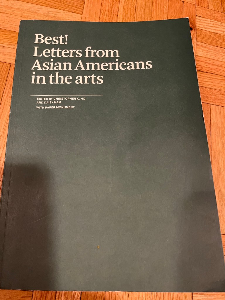 Letter writing seems positively subversive these days. I revere these tangible documents one can palm-the paper with hints of fragrance, fingerprints and/or doodles. Letters have indeed, been on my mind. Recently, my son picked out the above photographed compilation of letters written by various Asian-American creatives during a visit to the Whitney museum, a book I viewed skeptically due to its academic cover; but lo and behold, it’s a captivating collection. These letters are anarchic– simmering with rage, insights, humor and revelations. The editors of this collection gave the following prompt to the group of established creatives: