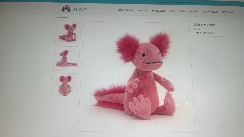 My kids oohed and ahhed over this soft looking Jellycat toy axelotl so I had to add this. (These creatures are a lot cuter in stuffed form I have to say. The last time I saw one, I was in a Philadelphia plant shop and it was floating around in a tank–unappealingly frail; its wiry limbs were flailing in murky water. It had an angry vibe and a green shade that apparently did not bode well for its longevity. Nor do I greet news that their limbs regenerate if chopped off, mildly. This other-worldly ability is alarming and I do not need to see another one soon. (However, this stuffed one really speaks to me).