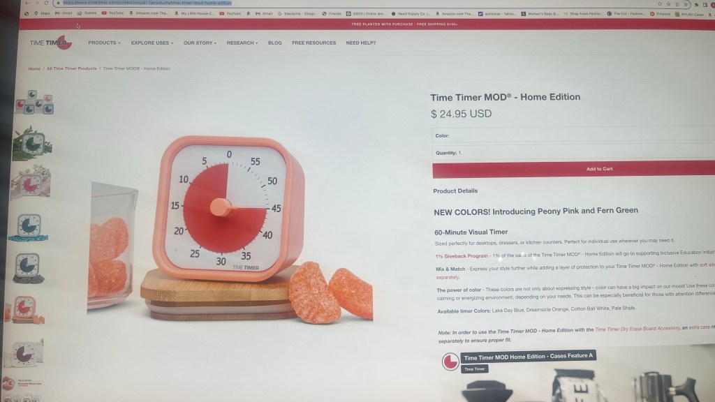 A friend with ADHD told me she uses her i-phone alarm and sets her timer for every aspect of her life. I may try doing this but I just found these adorable timers that any ADHD-er would appreciate. They are colorful/visually appealing and I like how the passing time is visualized. It’s a drab, judge-y gift so drop it into a gift bag along with something more decadent, e.g, a Chanel purse or something that says “you’re always late but fuck it, enjoy life” like some quality edibles or a luxe bottle of wine. (See the photo below that shows the timer with colorful, almost anthropomorphic gummy candies leaning unappealingly on the stand but candy would go well).