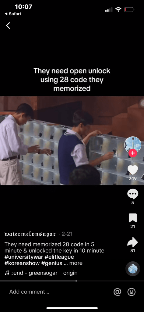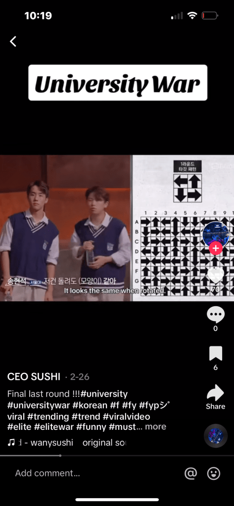 From what I can gage from YouTube snippets (as it’s not available to us on mainstream streaming sites), this game show consists of roughly six teams of contestants who are students from Korea’s top Universities who are competing to be the smartest University. In each episode, they compete to solve dizzying geometric puzzles, math problems so complex I had no ability to even recognize what genre of math is involved, and some challenges that are like an Escape Room created by a psycho sadist, e.g., each team member memorizing ten four-digit locker codes and then attempting to open ten lockers before the opponent team.(As someone who refuses to even lock my gym locker in fear of forgetting one 4-digit code, this Blows My Mind!)