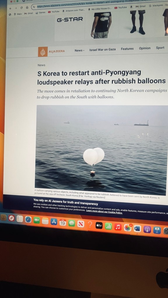 If you are like me, you also want to understand the South Korean tactic of responding to shit balloons with sound relays. Apparently, sound relays consist of South Korea placing loudspeakers at the North/South Korean border to loudly broadcast international news and Kpop, with the goal of decreasing the morale of North Koreans, e.g, the North Korean military, who live near the border. (For context, North Korea has banned the playing of Kpop, no doubt worried that the contagious music/dance moves combined with the visuals of the performers will spur young North Koreans to defect either physically or metaphysically.) As someone married to a proud audiophile, I am wondering what decibel is reached by these loudspeakers. I wonder if the broadcasts are louder than the music my husband blasts from two casket-sized speakers that shake the foundations of his beloved music room and rattle my innards (especially when he plays base-heavy tunes)? If so, I sympathize!