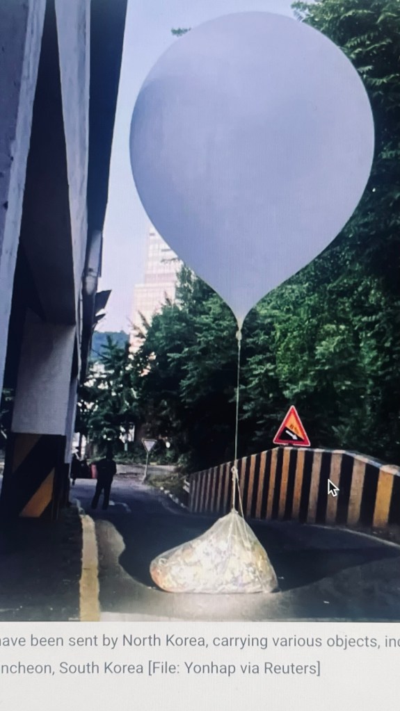 Update: North Koreans responded to the South’s sound relays by sending off more trash balloons that burst open on the South Korean President’s compound. What’s South Korea’s next move? Let’s hope it stays in the realm of child’s play, e.g., sending the North balloons filled with collagen supplements, face masks and other coveted South Korean skin care products. Stay tuned.