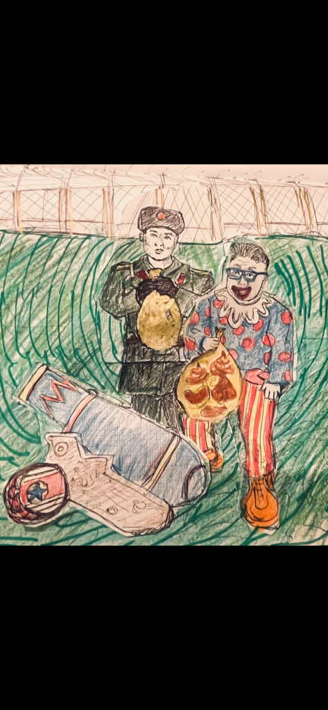 Clearly fixated on these waste-filled balloons, I have questions that suggest I am someone interested in mechanics and Physics but I’m not, e.g, how do these nations project the balloons into enemy territory? I am imagining their soldiers winding their arms like professional pitchers and throwing the balloons (and their attached bag of waste) from the deck of their imperial ships, only to watch them drift sadly into the water. Or do they shove it all into a cannon? See my drawing of Kim Jong Un the clown loading a cannon with poo balloons. (To make it easier for me to draw, I drew the poo inside the balloon instead of the bag attached to the balloon but I think you probably didn’t notice this discrepancy!) It turns out (shucks!) none of the above ridiculous methods were used; North Korea used planes to drop the balloons onto the South Korean side of the border.